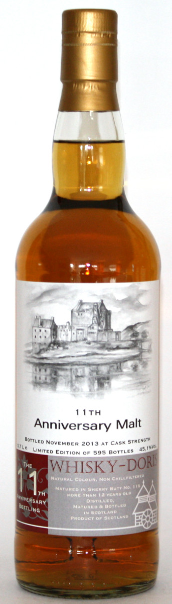 mit 45,1% Fassstärke abgefüllt. In der Nase zeigen sich sofort jede Menge Früchte - sowohl reife exotische (Mango, Aprikose) als auch trockene (Rosine, Backpflaume), danach Honig in unterschiedlichen Facetten (Wald-, Tannen-, Rapshonig) und intensive, teils exotische Gewürze, das alles ist sehr eng miteinander verwoben und wunderbar komplex und tief - super lecker! Im Mund erfolgt ein wunderbarer Antritt aus Gewürz- und Honig-Aromen, die von sehr eleganten Früchten (jetzt deutlich Marille) begleitet werden, das Mundgefühl ist ausgesprochen cremig, rund und weich - wow, was für ein Gaumenschmeichler! Das Finish ist von eher mittlerer Länge mit einem Echo aller Aromen - was für ein toller, alter Whisky! Tipp: dieser Abfüllung sollten Sie auch einige Zeit zum Atmen geben, damit sich alle Aromen zeigen können - es lohnt sich! Diese leckere Abfüllung ist leider ausverkauft!Beurteilung von Ruben Luyten (www.whiskynotes.be): 11th Anniversary Malt (45,1%, Whisky-Doris 2013, sherry butt #115, 595 btl.) Nose: inviting scents. Lots of berries and