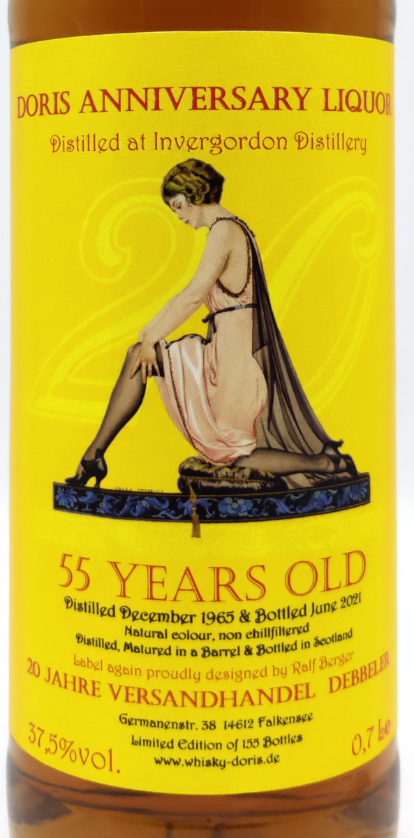 An der Nase zeigt dieser leckere und sehr alte Invergordon jede Menge Kokos, reife Früchte, eine angenehme Würze vom Fass, würziger Honig, etwas Schokolade und eine sehr elegante Süße - für "nur" 37,5% eine erstaunlich intensive und vielversprechende Nase! Der Antritt im Mund ist elegant und erstaunlich intensiv. Es zeigen sich sehr schöne süße Aromen von Kokos, gebrannten Mandeln, reifen Früchte und Honig bevor dann die würzigen und trockeneren Aromen in den Vordergrund rücken - eine tolle Aromenentwicklung und Tiefe, ein vielschichtiger und komplexer 55jähriger Invergordon! Das Finish ist eher kurz bis mittellang zunächst auf der würzigen Seite, dann sehr elegant und wieder süß - richtig leckerer, alter Invergordon wie er sein soll! Tipp: auch diesem sehr alten Invergordon sollten Sie etwas Zeit zum Atmen geben, damit sich alle Aromen zeigen können - es lohnt sich! Das Label ist created by Ralf Berger und zeigt ein Motiv von Coles Phillips.