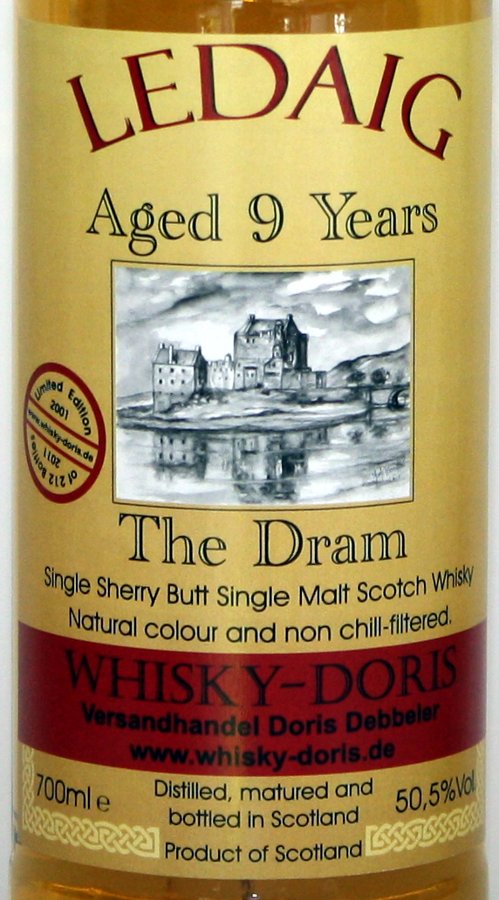 Dieser sehr leckere 9jährige Ledaig stammt aus einem Sherry Butt (vermutlich refill) und wurde mit 50,5% abgefüllt (gleiches Fass wie unser 2001er mit 60,6%). In der Nase zeigen sich sofort deutliche Schwaden von Schinkenrauch und salziger Meeresbrise, dann kommen Gewürze, Frucht (Melone)- und Bauernhof-Aromen, die von einer späten Torfigkeit ergänzt werden - vielschichtig und sehr lecker! Im Mund erfolgt ein kerniger, rauchig-torfier Antritt (Islay läßt Grüßen!), dann zeigt sich die salzige Meeresbrise, die dann von süßeren Aromen (Waldhonig mit reifen Früchten in Schokolade) abgelöst werden - ein facettenreicher, vielschichtiger und sehr leckerer Ledaig - für nur 9 Jahre absolut erstaunlich! Das Finish ist lang und wärmend, die salzige Meeresbrise, süßere Aromen und Rauch/Torf bilden ein wunderbares Wechselspiel der Aomen - erstaunlich komplexer Ledaig! Dieser leckere Ledaig ist nicht mehr verfügbar! Beurteilung von Ruben Luyten (www.whiskynotes.be):Ledaig 9 yo 2001 (50,5%, Whisky-Doris 2011, sherry butt, 212 btl.) Nose: big peat, exhaust fumes and smoked meat. Unique hints of pimentón (smoked paprika powder, commonly used in Spain to prepare Pulpo a la Gallega). Then big coastal notes (cod-liver oil, sea air, smoked fish) and hints of rubber boots. Quite farmy as well: wet earth, a little yeast. Underneath a nice layer of dried fruits and burnt sugar from the sherry. Fresh lemon and ginger. Some Mexican chocolate with spices. High complexity considering the age. Mouth: oily mouth-feel, with earthy peat but also a honey coating. Lemon. Coastal notes again. Less complex now, but very clean. Finish: very long, peaty and slightly chocolaty with a salty note. A well-made peat bomb, with plenty of peat and coastalness but also quite rounded thanks to the sweeter sherry notes. Score: 87/100 Beurteilung von Serge Valentin (www.whiskyfun.com): Ledaig 9 yo 2001/2011 (50,5%, Whisky-Doris, The Dram, sherry butt, 212 bottles)