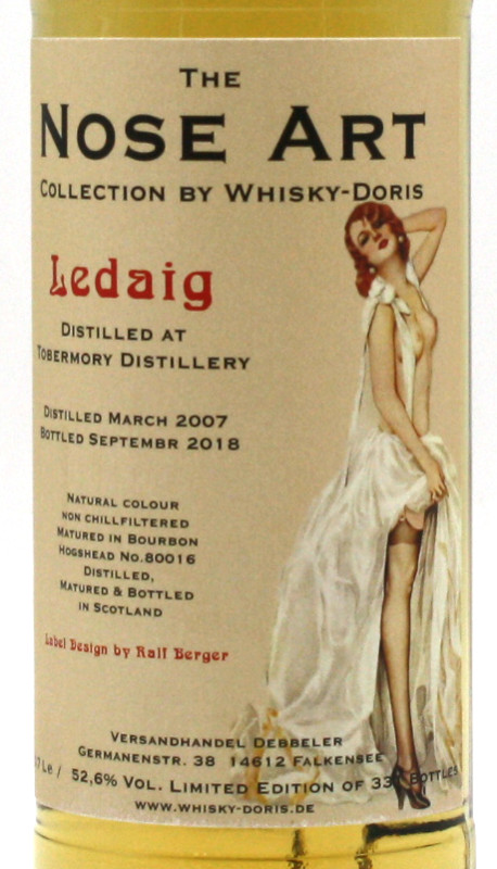 Dieser 11jährige Ledaig wurde im März 2007 in der Tobermory Distillery auf Mull destilliert und reifte 11 Jahre in einem Bourbon Hogshead. An der Nase zeigt dieser junge Ledaig sofort wo es lang geht: heavily peated mit maritim-süßem Einschlag - großartig! Dazu gesellen sich Aromen von altem Leder (leicht schmutzig), frisch gemähter Wiese und Honig. Im Mund erfolgt ein samtiger, fruchtig-süßer Antritt, der schnell durch deutlichen Rauch und maritime Aromen ergänzt wird - erstaunlich harmonisch und richtig lecker! Das Finish ist lang mit einem tollen Wechselspiel aus Süße und Rauch - was für ein Ledaig! Das Label stammt von Ralf Berger und zeigt ein Motiv von Alberto Vargas.