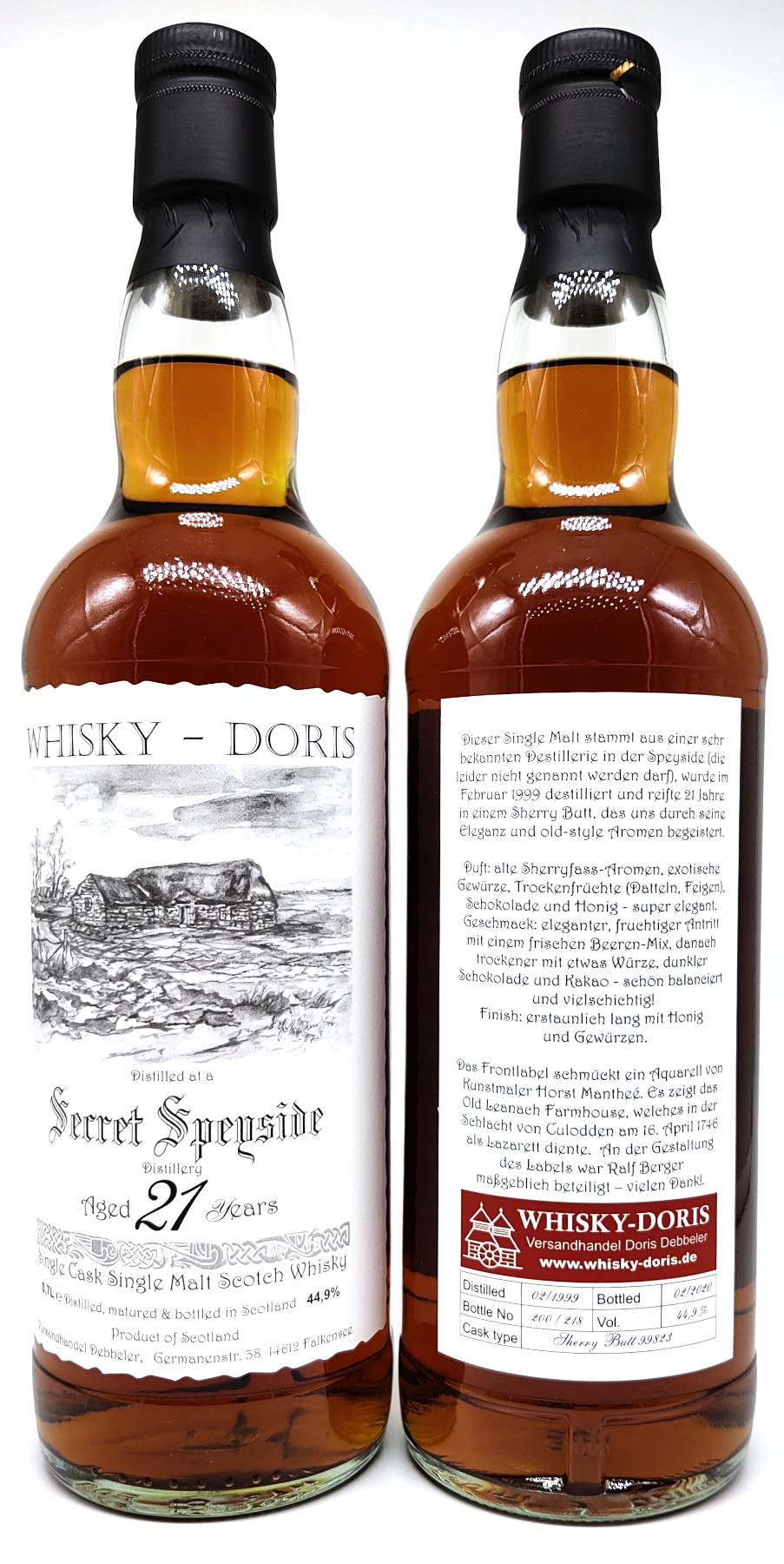 Dieser Single Malt stammt aus einer sehr bekannte Destille in der Speyside (die leider nicht genannt werden darf), wurde im Februar 1999 destilliert und reifte 21 Jahre in einem Sherry Butt, das uns durch seine Eleganz und old-style-Aromen begeistert. An der Nase zeigt dieser tolle Secret Speyside alte Sherryfass-Aromen, exotische Gewürze, Trockenfrüchte (Datteln, Feigen), Schokolade und Honig - super elegant! Im Mund erfolgt ein eleganter, fruchtiger Antritt mit einem frischen Beeren-Mix, danach trockener mit etwas Würze, dunkler Schokolade und Kakao - schön balanciert und vielschichtig! Das Finish ist erstaunlich lang mit Honig und Gewürzen - ein toller, gereifter Speysider! Geben Sie bitte diesem Secret Speyside Zeit zum Atmen - es lohnt sich! Das Frontlabel schmückt ein Aquarell von Kunstmaler Horst Manthèe (Hotte). Es zeigt das Old Leanach Farmhouse, welches in der Schlacht von Culodden am 16. April 1746 als Lazarett diente. Die Abfüllung ist natürlich auch als Sample verfügbar.